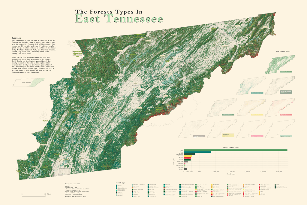 This map is primarily based on the USDA TreeMap (2016) raster dataset. The raster is a 30-meter resolution discrete layer showing the forest coverage by tree species. To reduce complexity, the tree species were combined by type (e.g., oak, pine, poplar, etc.) via the color ramp for the main map, and the reclassification for the small multiples to filter the other forest types. New colors were chosen based on the color of the tree leaf in autumn, sans the oak forests, which have many subspecies.