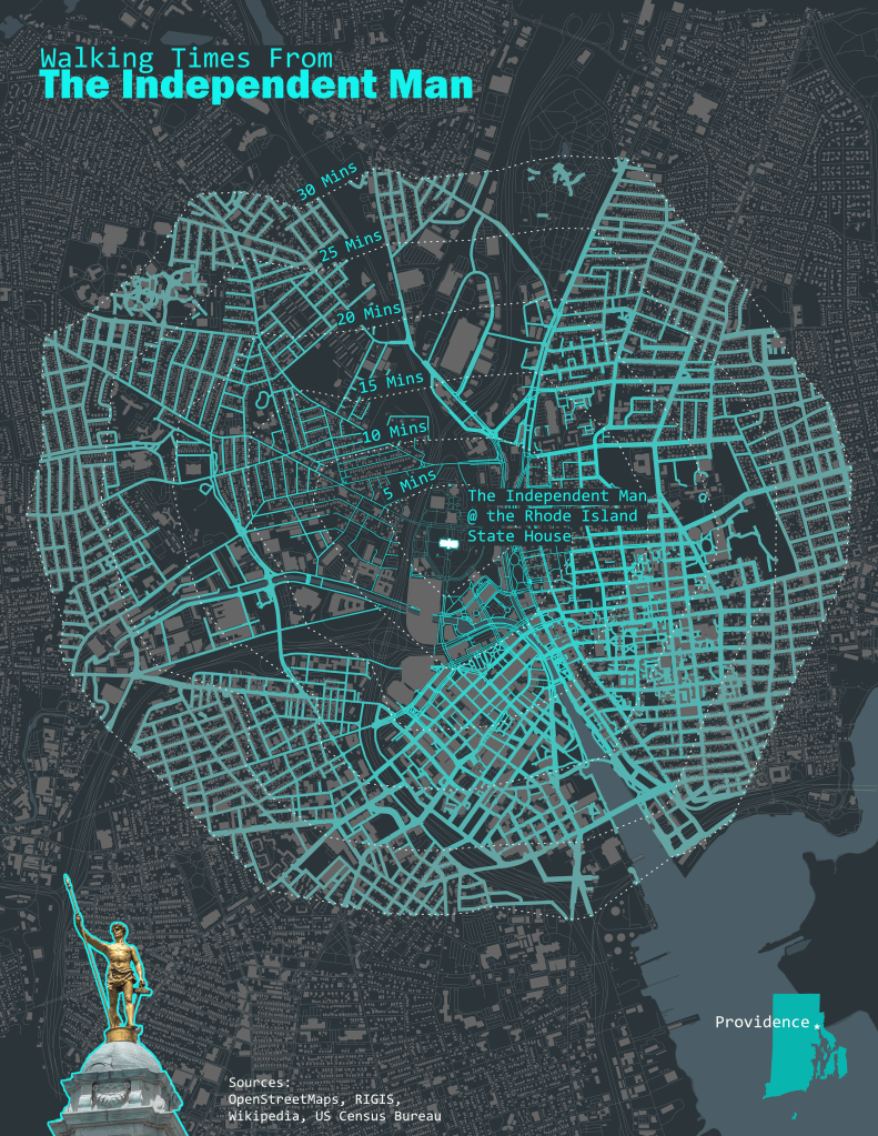 Day 7 – AccessibilityWalking Times from the Independent ManThe Independent Man is a gold-plated bronze statue on top of the Rhode Island State House, located in Providence, RI. This is an isochrone map that I made more complicated by symbolizing the roads by color and weight.#30DayMapChallenge