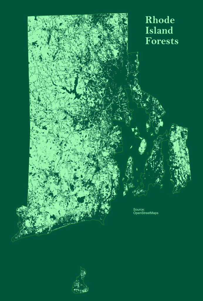Day 14 – OpenStreetMapRhode Island ForestsRhode Island's OSM forest coverage is very good. This source may be an option for my other maps. I spent a few hours creating a map similar to the forest types map from day 2 before changing directions to a more minimalist design. #30DayMapChallenge