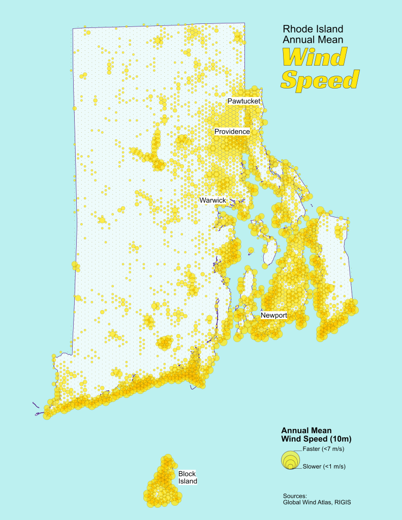 Day 10 – AirRhode Island Annual Mean Wind Speed πRI coastlines, urban areas, and lakes are pretty windy at the surface level. Prudence Island was a little surprising, given the stories from early settlers. Poor Block Island, though (probably my symbology). #30DayMapChallenge