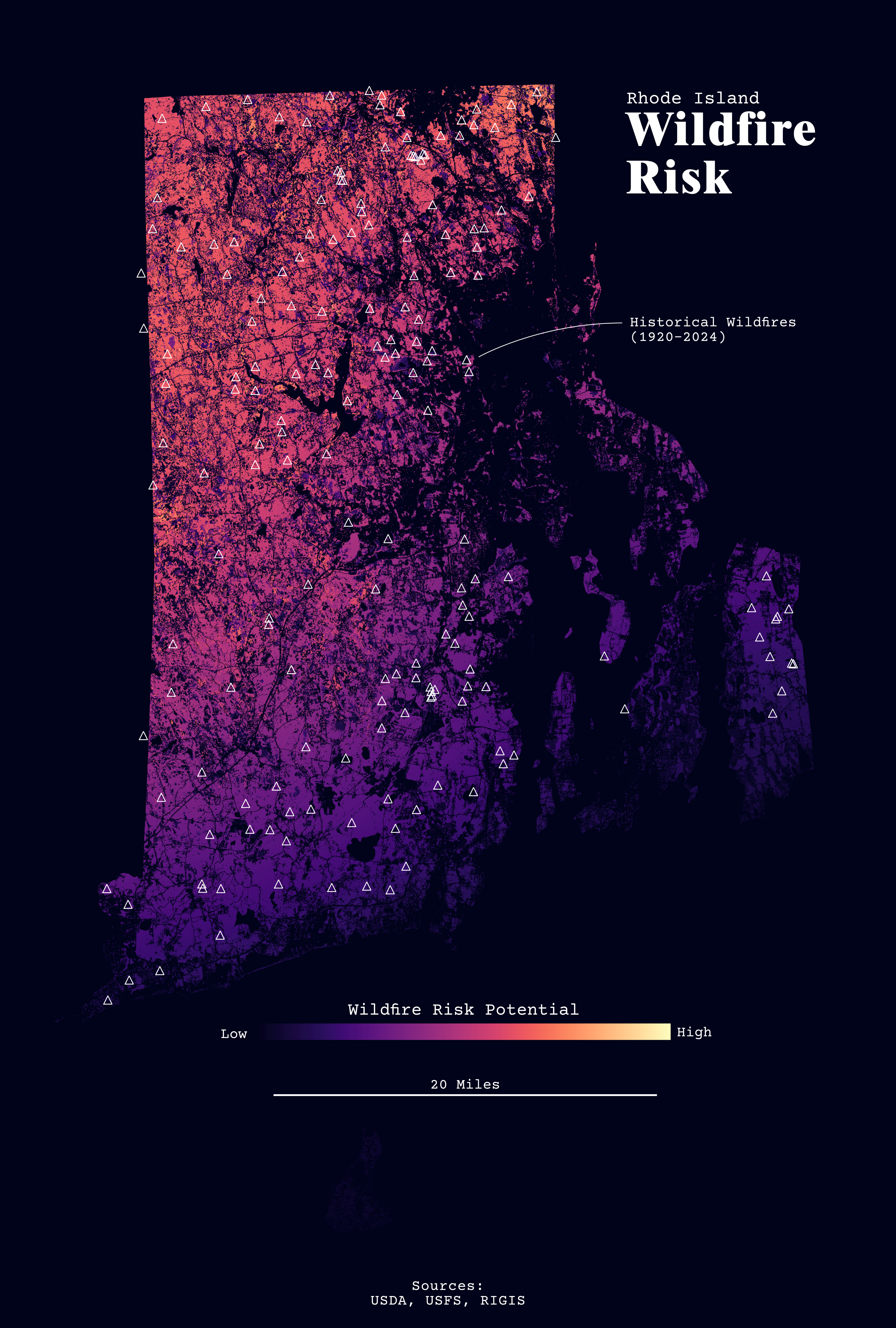 Day 15 – FireRhode Island Wildfire RiskI swear I am not making the same forest map over and over again. 😂Overall, RI has a very low wildfire risk. It is probably no surprise that the forested areas are at higher risk. The risk also increases from north to south.#30DayMapChallenge