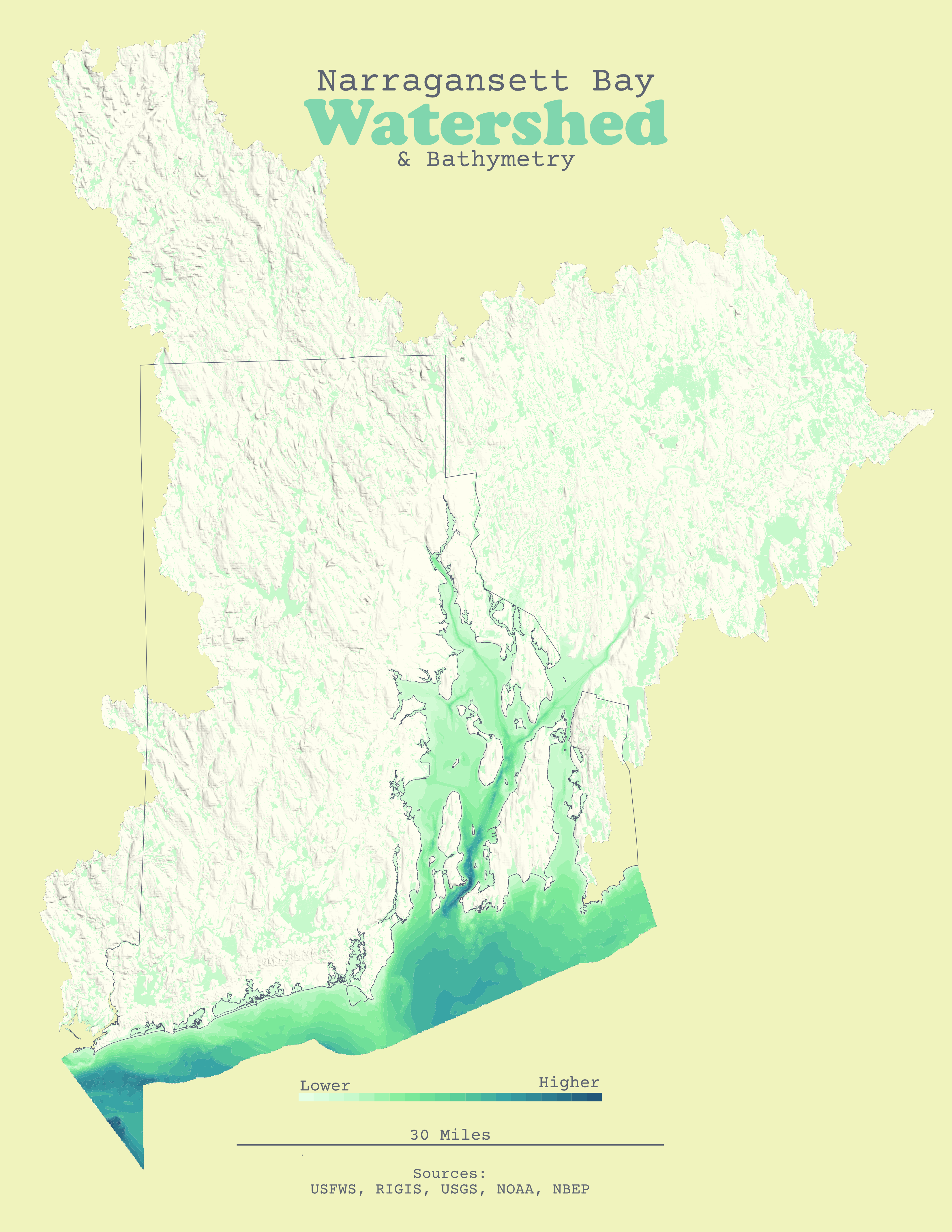 Day 20 – WaterNarragansett Bay Watershed10 Days to go! I am starting to feel a little repetitive. 😰 The bathymetry saved this one. Almost all of Rhode Island is in the Narragansett Bay Watershed. I think I will expand this one into a large format map one day.#30DayMapChallenge
