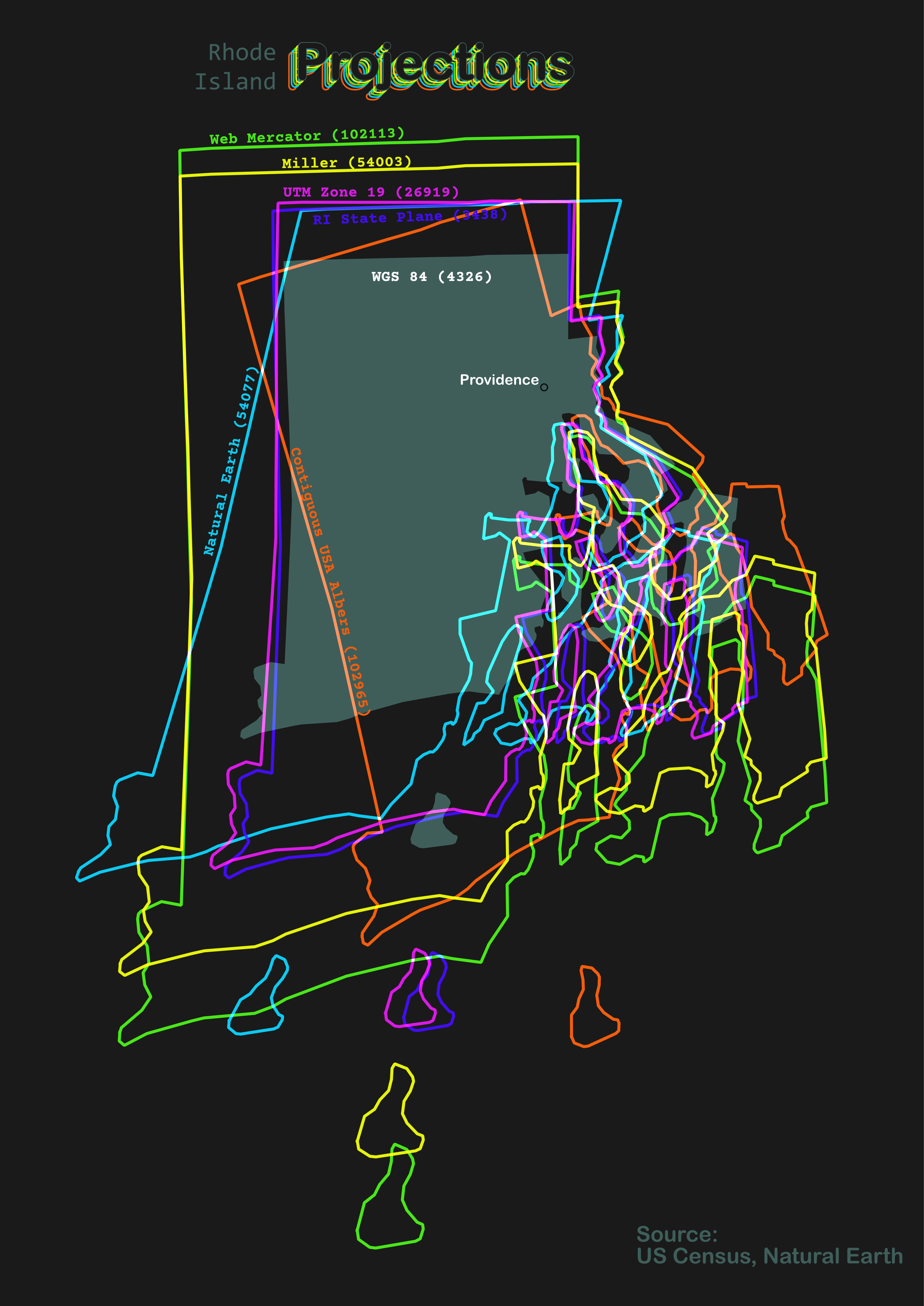 Day 19 – ProjectionsRhode Island ProjectionsAll caught up!I wanted to compare a few projections I have tried with my Rhode Island maps. These projections are centered on Providence, similar to @kennethkhw.bsky.social map.#30DayMapChallenge