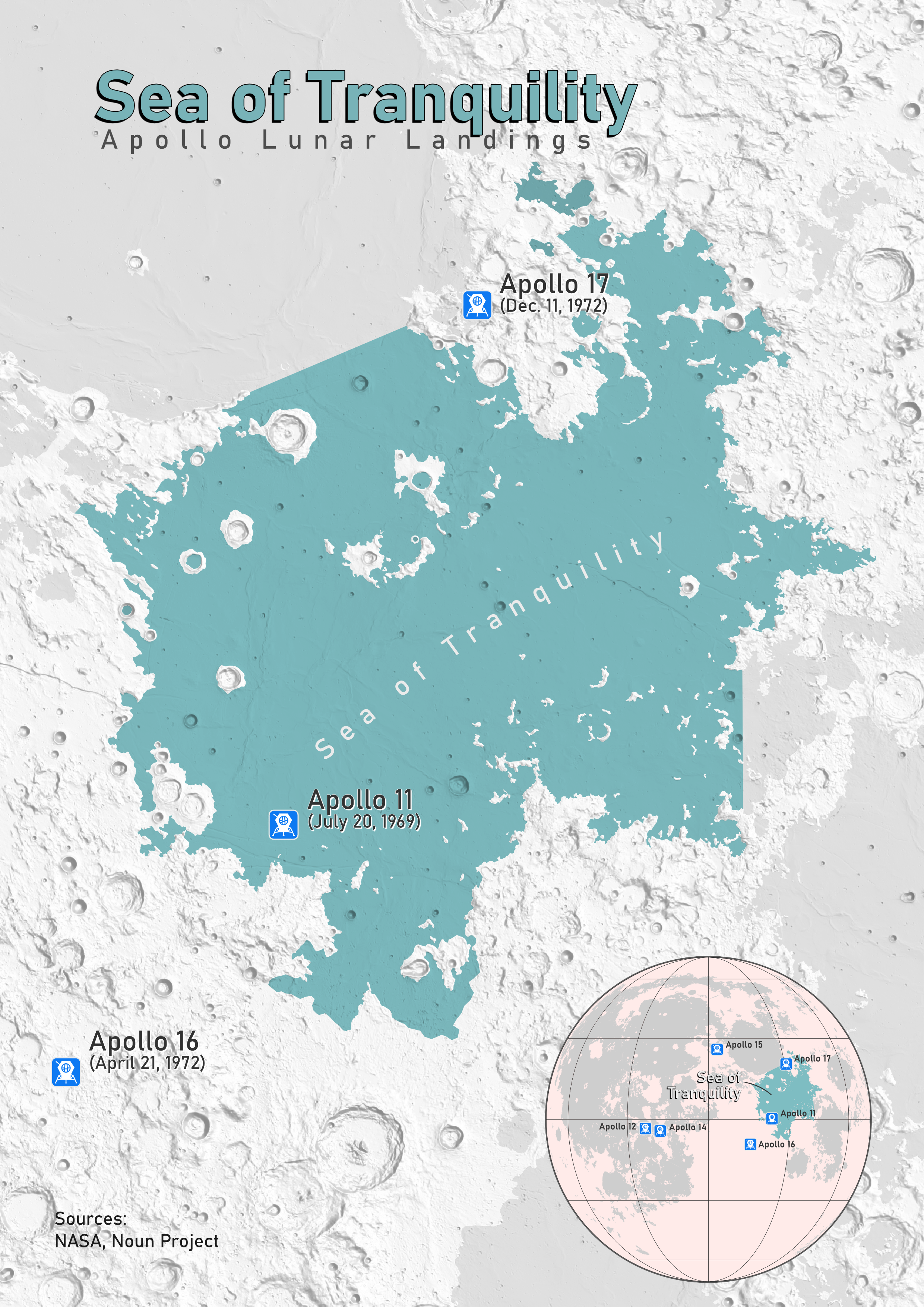 Day 18 – Out of This WorldSea of Tranquility Apollo Lunar LandingsTechnically, there is just the one Apollo mission in the Mare Tranquilitus, but the others are in the extent. Fun fact: I grew up in the Rocket City, and I was born on the anniversary of a lunar landing. #30DayMapChallenge