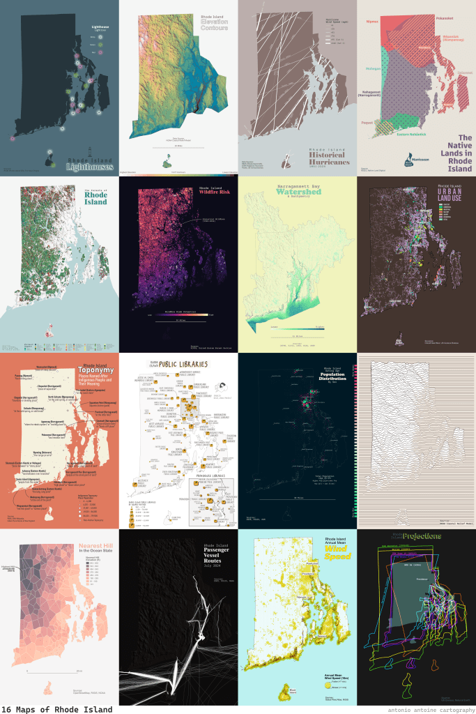 To cap off the 2025 #30DayMapChallenge, I made a map quilt featuring my favorite maps I made of Rhode Island. A few of the early maps had to be redone to include Block Island at my preferred scale.